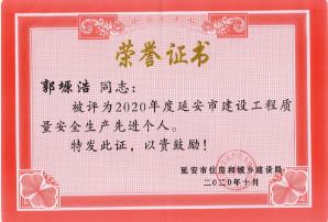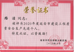 路潔、郭塬浩榮獲“延安市建設(shè)工程質(zhì)量安全生產(chǎn)先進(jìn)個人”榮譽稱號。