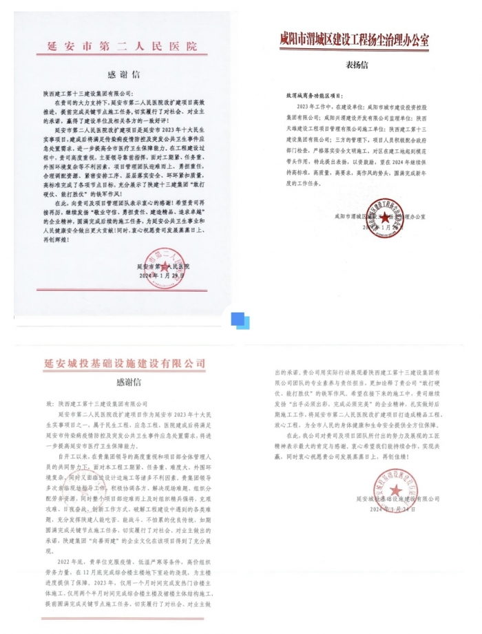 近日,集團(tuán)第二工程公司施工的延安市第二人民醫(yī)院改擴(kuò)建項目、咸陽渭城商務(wù)功能區(qū)項目收到建設(shè)單位發(fā)來的感謝信、表揚(yáng)信,對集團(tuán)在項目高質(zhì)量建設(shè)中的傾情付出表示感謝,為項目團(tuán)隊在施工過程中表現(xiàn)出的敬業(yè)精神表示贊揚(yáng)。