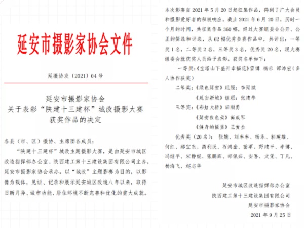 “陜建十三建杯”城改攝影比賽旨在用相機(jī)展示古城風(fēng)貌,以鏡頭凸顯圣地氛圍,展現(xiàn)新時(shí)代之下延安市的發(fā)展之美、和諧之美。影賽自開展以來,得到了廣大攝影愛好者的積極參與、踴躍投稿,共收到攝影作品350余幅,經(jīng)過攝影協(xié)會(huì)專業(yè)評(píng)委嚴(yán)格公平評(píng)選,共評(píng)選出一等獎(jiǎng)作品1幅,二等獎(jiǎng)作品2幅,三等獎(jiǎng)作品3幅,優(yōu)秀作品20幅。